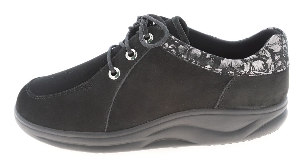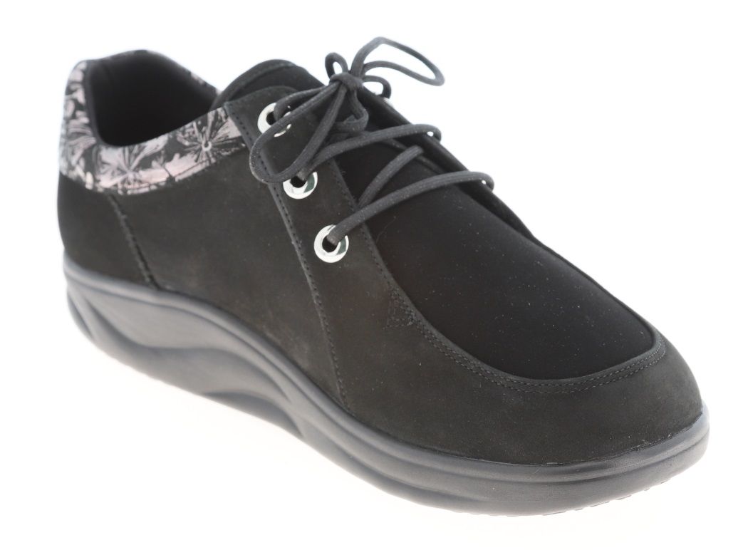 Полуботинок снабжен несколько большей чем обычно уплотненной задней частью, сформированной из термопласта. Она позволяет надежно фиксировать пяточную область в естественном положении, к тому же задник держит форму достаточно долгое время. Изнутри ботинки достаточно широки, а вставка из трикотажа отлично растягивается, что позволяет добавить в обувь орто-стельку, индивидуально изготовленную.